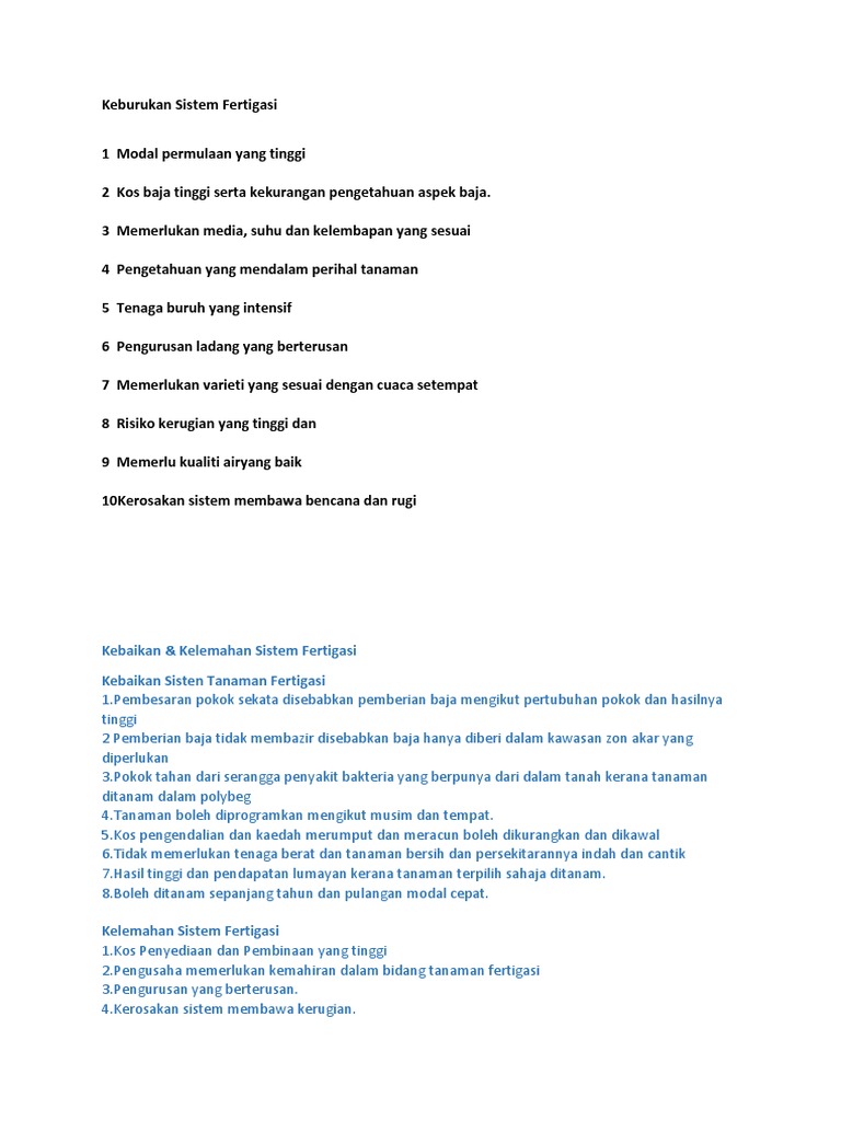Projek ucam perkongsian daripada dr muzamil kaedah penanaman secara fertiga. 3 Memerlukan media suhu dan kelembapan yang sesuai 4 Pengetahuan yang mendalam perihal tanaman 5 Tenaga buruh yang intensif 6 Pengurusan ladang yang berterusan. Bila kekurangan atau kelebihan akan mengakibatkan pertumbuhan tanaman terganggu dan hasil produksi yang diperoleh pun kadang kurang maksimal.