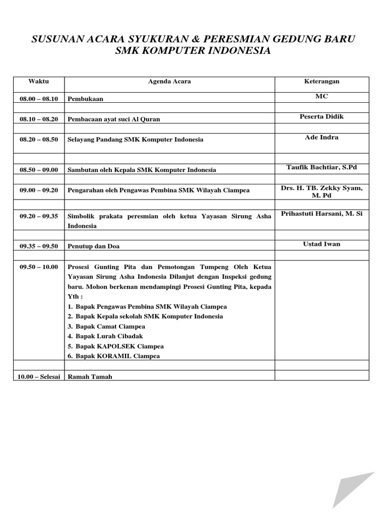 Contoh Surat - Surat Pengajuan. Contoh MC Acara Formal. CONTOH SUSUNAN ACARA PERESMIAN MASJID PERUSAHAAN.