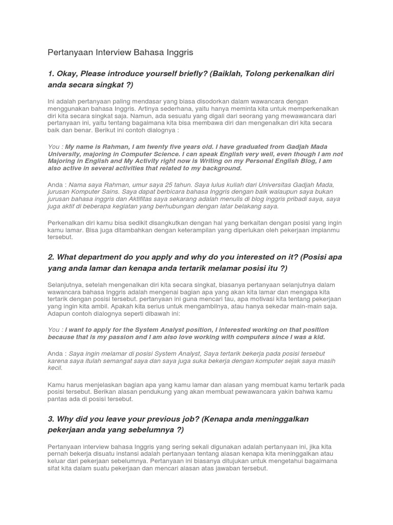 Please Introduce Yourself Briefly. Posting pada Speaking Ditag interview kerja bahasa inggris job interview pertanyaan dan jawaban untuk interview bahasa inggris question and answer. 50 Bocoran Pertanyaan Dan Jawaban Interview Kerja.