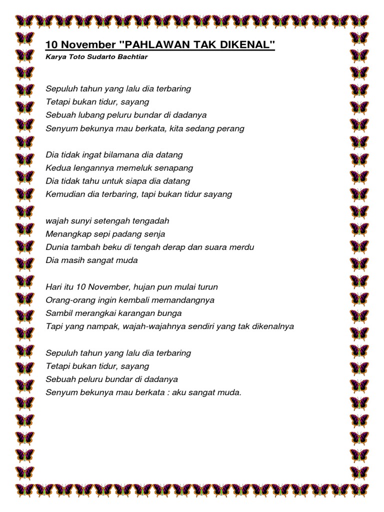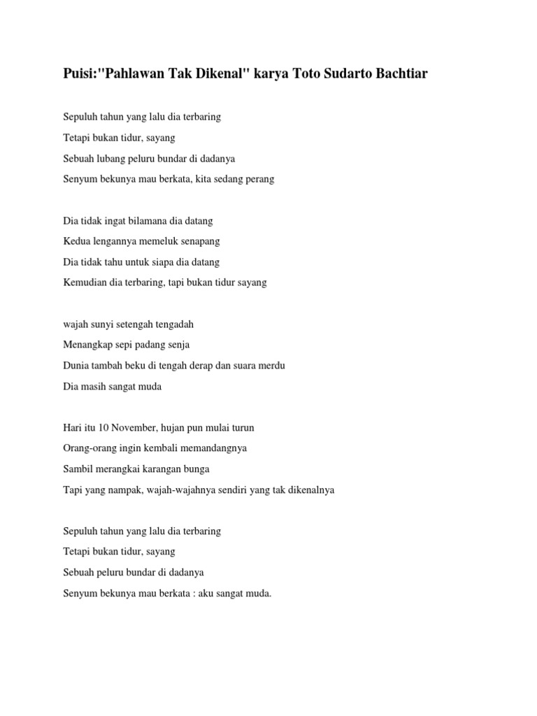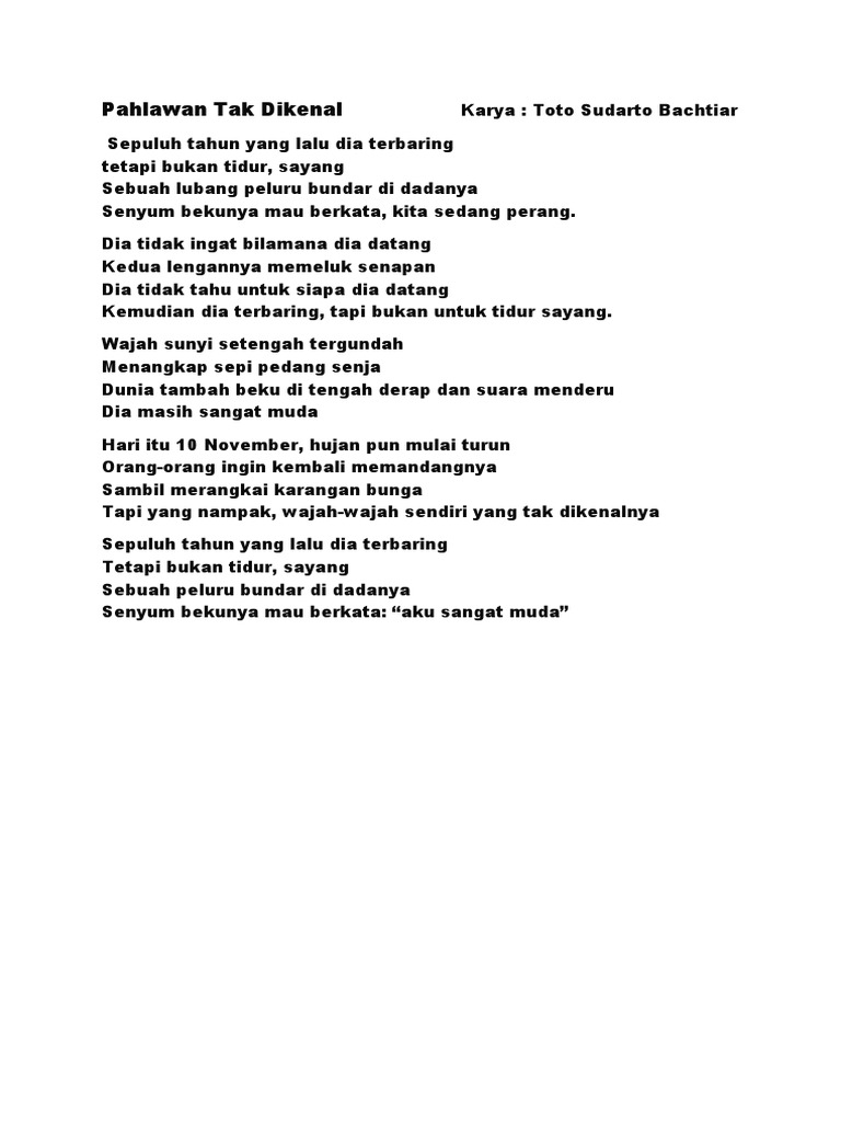 Toto Sudarto Bachtiar Sepuluh tahun yang lalu dia terbaring Tetapi bukan tidur sayang Sebuah lubang peluru bundar di dadanya Senyum bekunya mau berkata kita sedang perang Dia tidak ingat bilamana dia datang Kedua lengannya memeluk senapang Dia tidak tahu untuk siapa dia datang Kemudian dia terbaring tapi bukan tidur sayang wajah. PAHLAWAN TAK DIKENAL Oleh. Struktur dan ragam puisi sebagai hasil karya kreatif terus-menerus berubah.